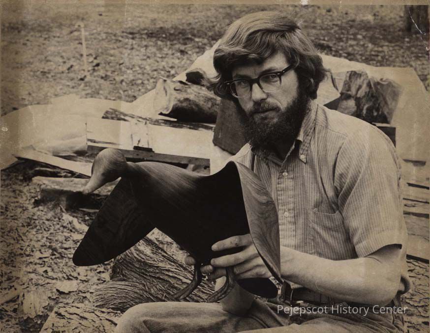 A B/W photographic view of Harry Tyler with one of his carvings.