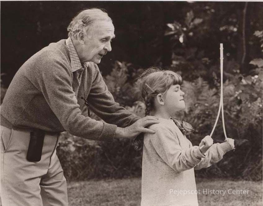 A B/W photographic view of Harvey Howells and Mary Callahan. Howells is teaching the little girl to dowse. This photo was published 9/13/1977.