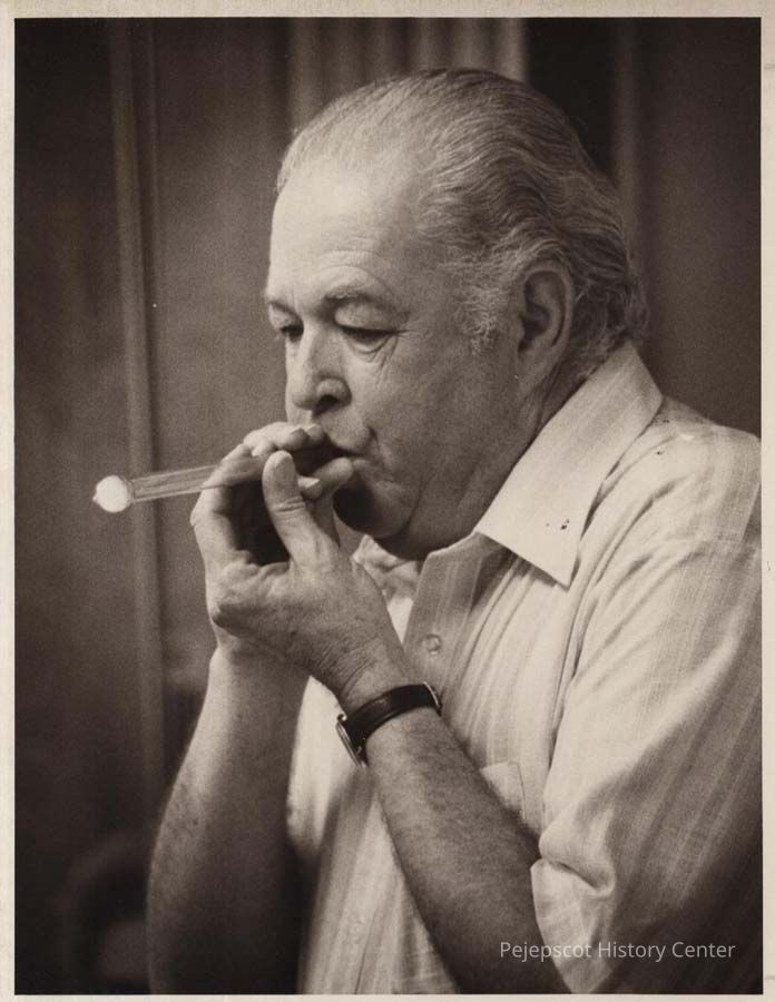 A B/W photographic view of Herbert Merrill blowing glass. This photo was published 4/17/1978.