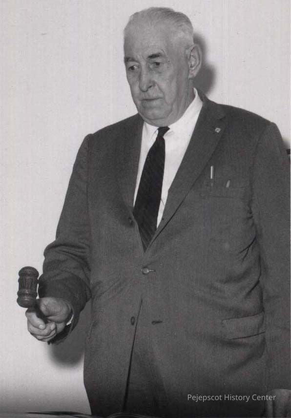 A B/W photographic view of Hugh Johnson at Harpswell Town Meeting..