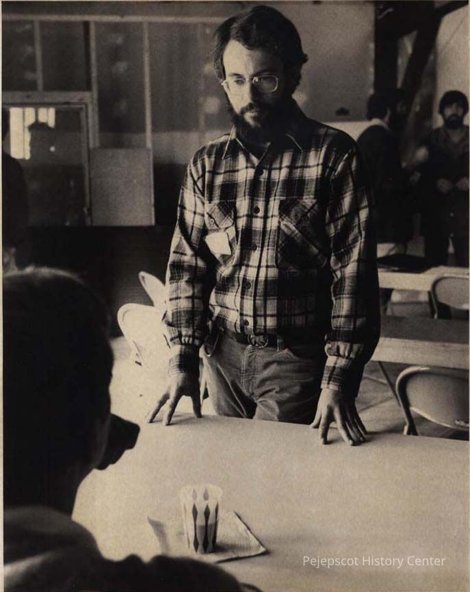 A B/W photographic view of James Hatch (of Cornerstones) listens as Robert Buck of Woolwich explains his greenhouse project.