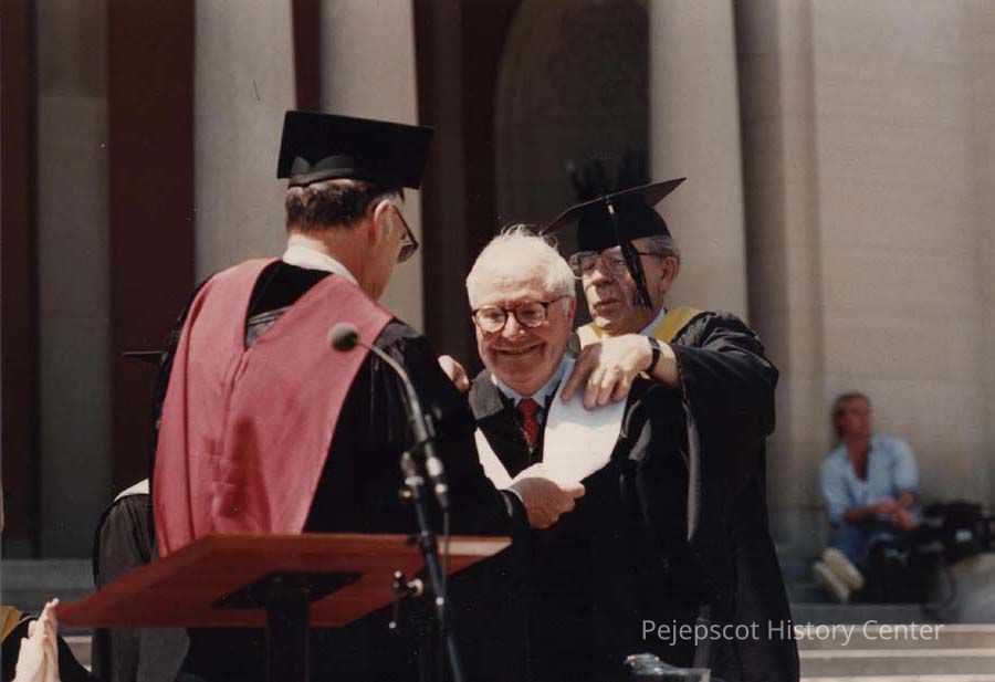 A color photographic view of James Russell Wiggins receiving a Honorary Doctor of Letters Degree from Bowdoin College President A.Leroy Greason who is helped by Arthur Monke. This photo was published 5/31/1988.