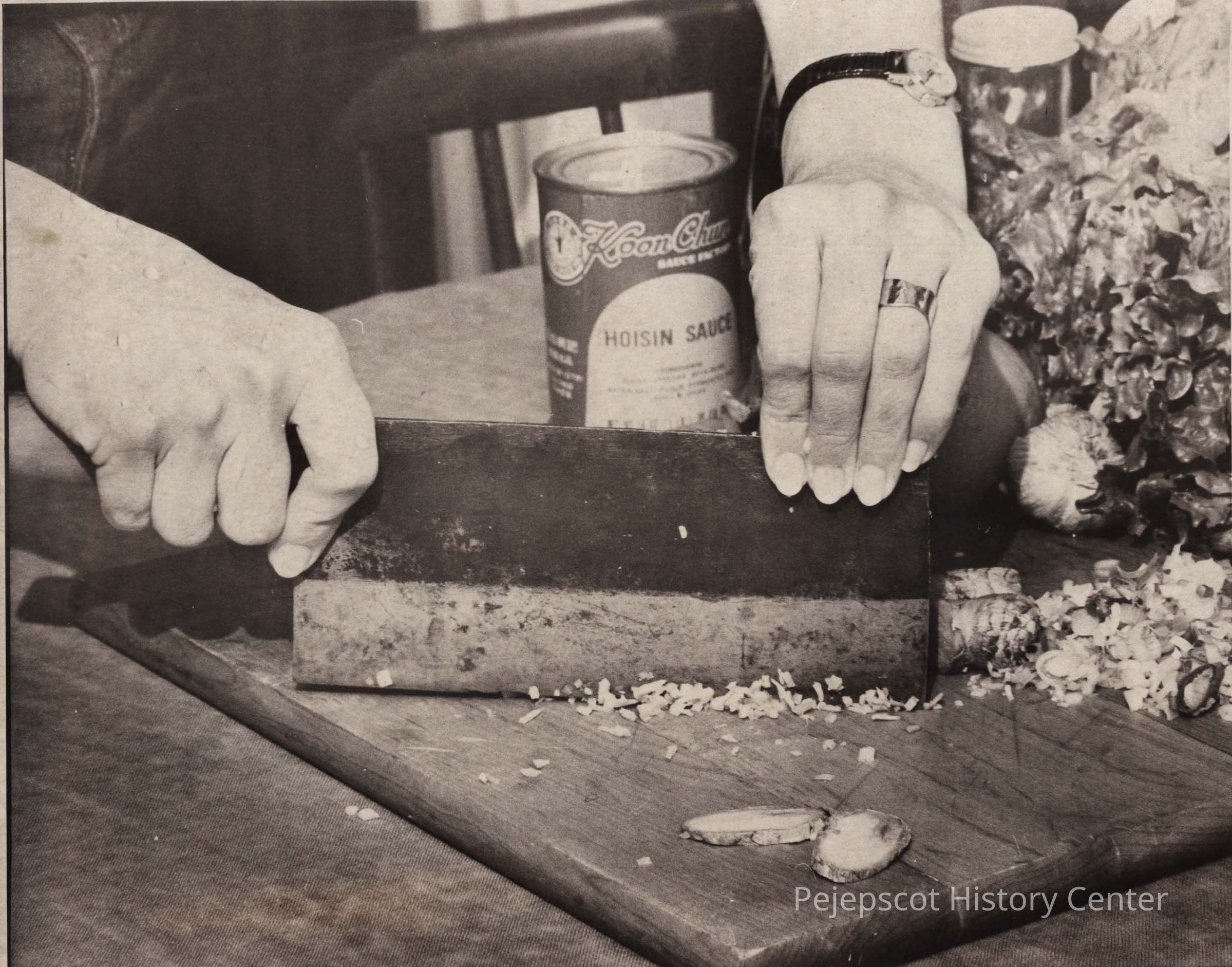 A B/W photographic view of Jan Wilk chopping green onions. This photo was published 6/1/1981.