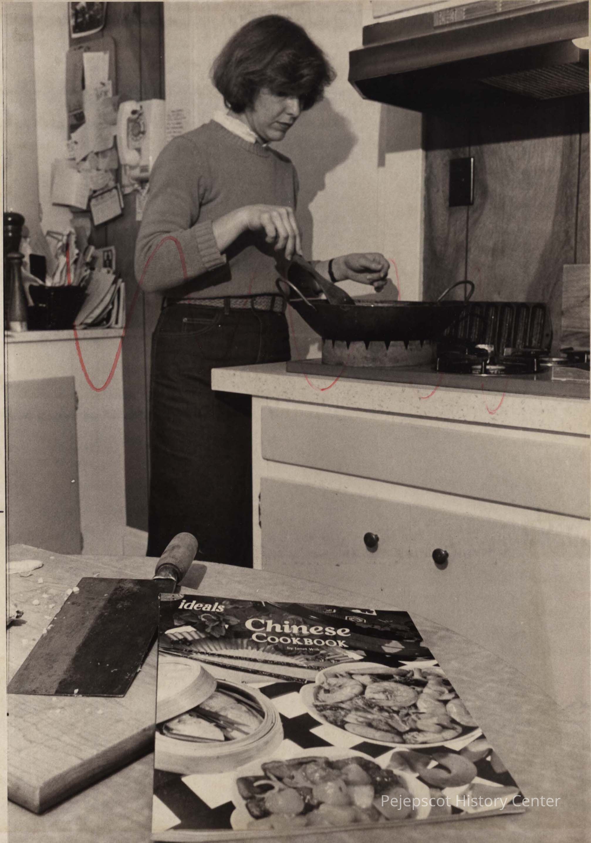 A B/W photographic view of Jan Wilk and her book, "Chinese Cookbook". This photo was published 6/1/1981.