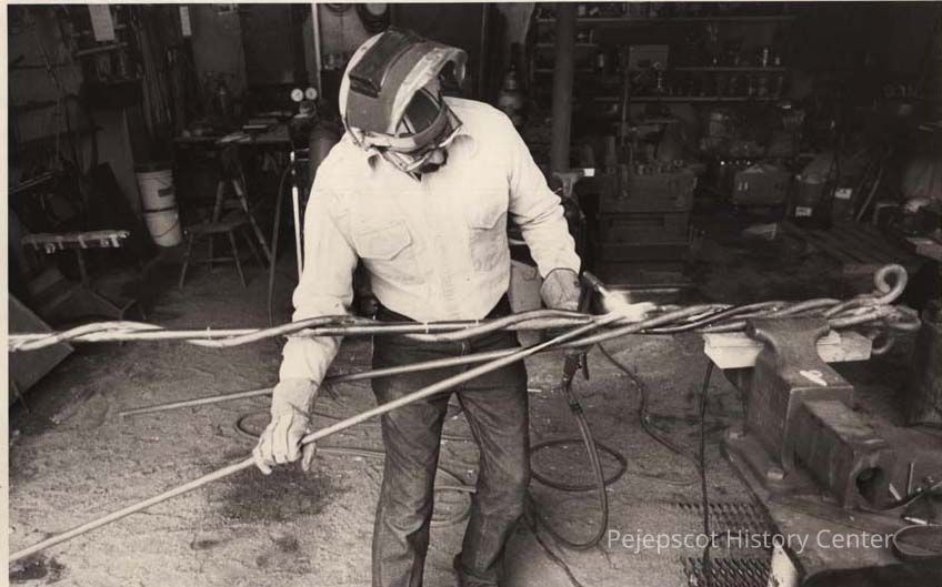 A B/W photographic view of Jim Bennis bending some rods. Marked on the front, "Using a torch to heat iron rod hot enough to twist it together.".