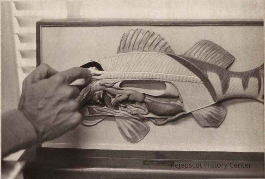 A B/W photographic view of Jim Moulton pointing to a fish's ear. This photo was published 7/3/1978.