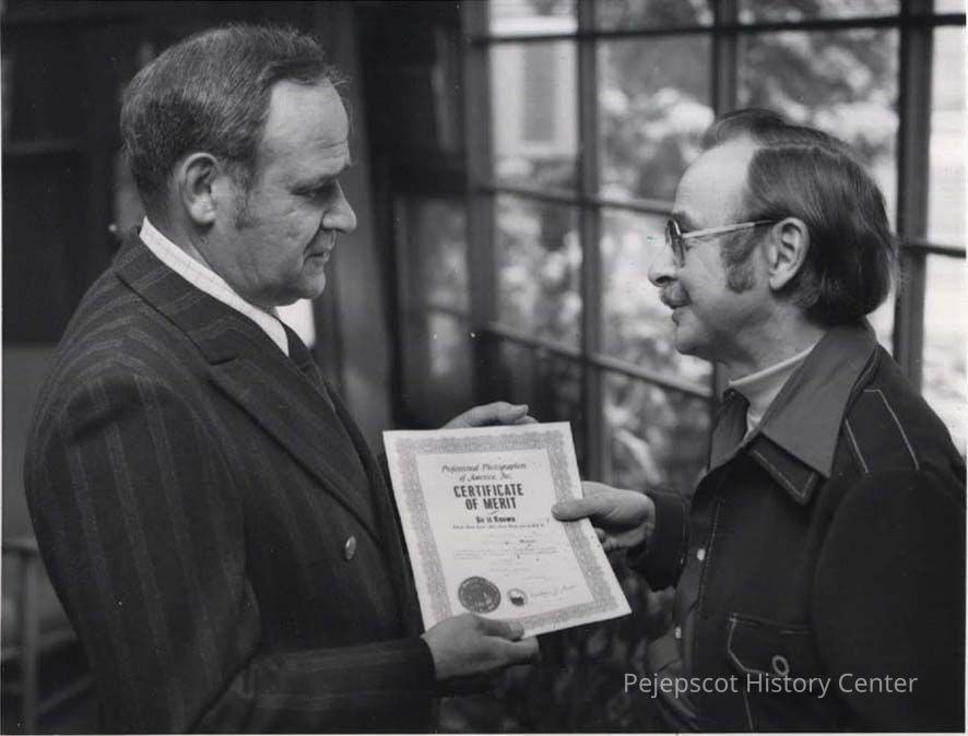 A B/W photographic view of Jim Pierce receiving an award from Joe Kachinski of Topsham, Maine's Director of the New England Institute of Professional Photography.