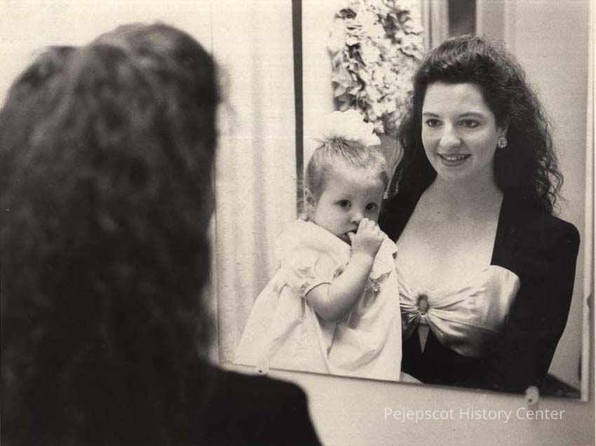 A B/W photographic view of Joanna Frazier and friend Molly admire their clothes. This photo was published 3/26/1992.