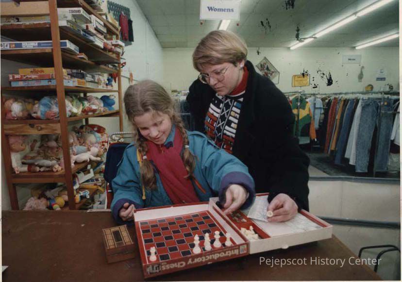 A color photographic view of Joanna Bragdon and daughter Jenny (age 8) at the Goodwill Thrift Shop. This photo was published 2/21/1992.