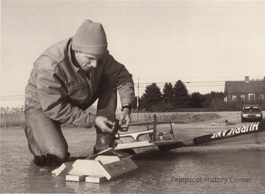 A B/W photographic view of John T. McMillan adjusting his ice boat. This photo was published 1/17/1992.
