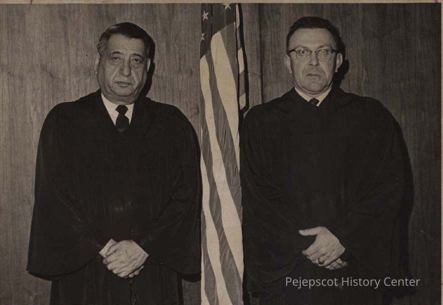 A B/W photographic view of Judge Ralph Ross, right, visiting his new headquarters in Brunswick for the first time. He has taken over the Brunswick division of the Eighth District Court headed by Judge Israel Alpren.