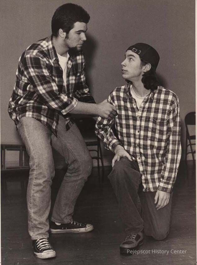 A B/W photographic view of Justin Boss and Don D'Alessio who starred in the Brunswick high production of "Godspell".