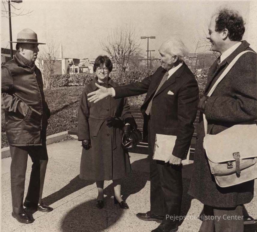 A B/W photographic view of Karl F. Heiser meeting group of people. This photo was published 2//2/1981