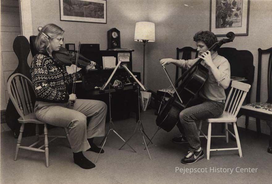 A B/W photographic view of Kristen Monke (18) and Andrew Walkling (17) members of the New England Conservatory Youth Chamber Orchestra.