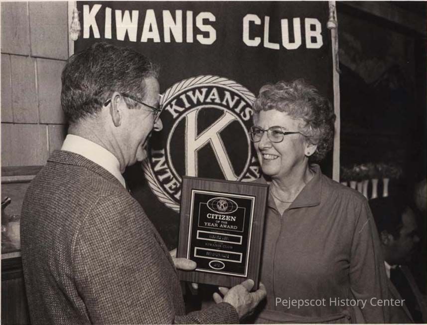 A B/W photographic view of Leon Doore, Kiwanis Club member, presents Marjorie Libby with the Citizen of the Year Award.