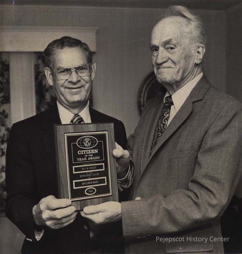 A B/W photographic view of Leon G. Dorr presenting Paul M. Langley with the Brunswick Area Kiwanis Club Citizen of the Year Award.