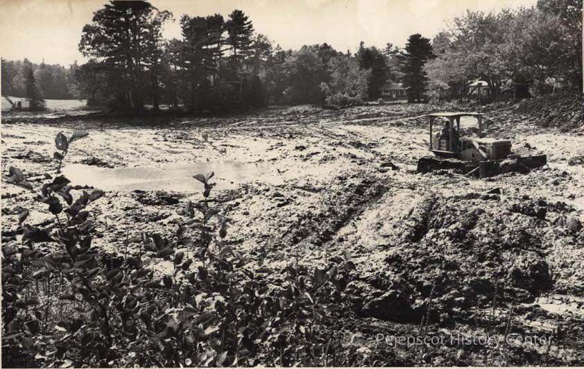 A B/W photographic view of Lewis Stuart cleaning his pond. Lilly pads were so thick that they choked off the pond. Cundy's Harbor.