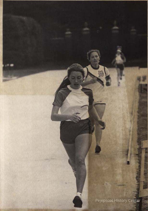 A B/W photographic view of Liz Poulin running track for Brunswick High School.. This photo was published 3/24/1981.