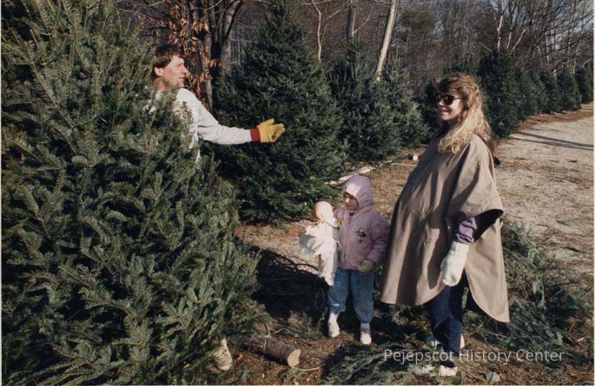 A color photographic view of Lori Herbert & daughter Kathleen selecting a Xmas Tree from Greg Leman. This photo was published 12/3/1991.