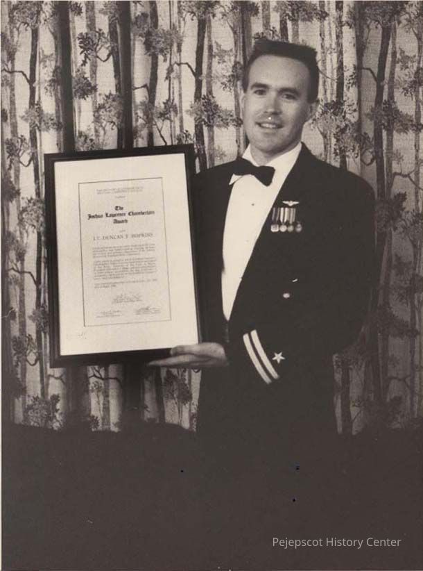 A B/W photographic view of Lt. Duncan Hopkins receiving the Joshua Lawrence Chamberlain Award from the Brunswick, Topsham, Bath Military Community College. 4/30/1990.
