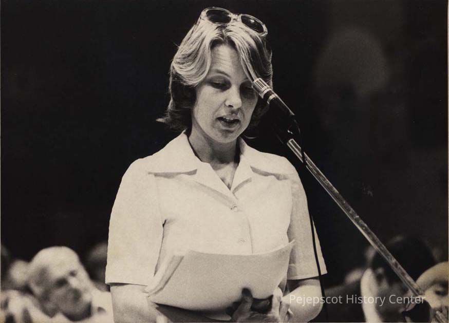 A B/W photographic view of Lyn Schramm at a Brunswick budget hearing. This photo was published 5/22/1980.