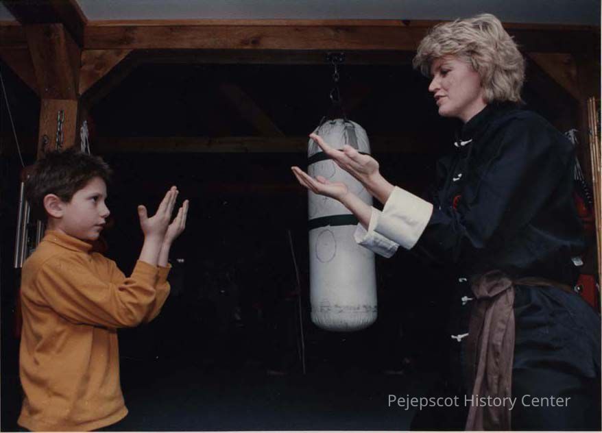 A color photographic view of Lynn Pulsifer of Riverview Martial Arts and Security Academy with Richard Schwary. This photo was published 2/5/1992.