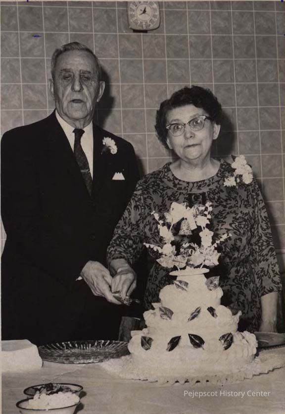 A B/W photographic view of Mr. & Mrs. Lorenzo F. Brillant. They appear to be cutting an anniversary cake.