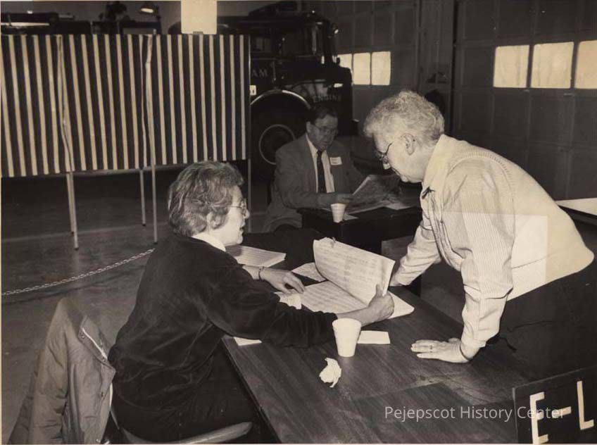A B/W photographic view of Mary Obery (seated) and Connie Talbot ballot clerks and Ray Harrison town clerk Topsham in the background.