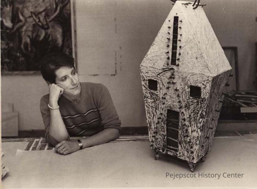 A B/W photographic view of Marjorie Moore and one of her pieces..