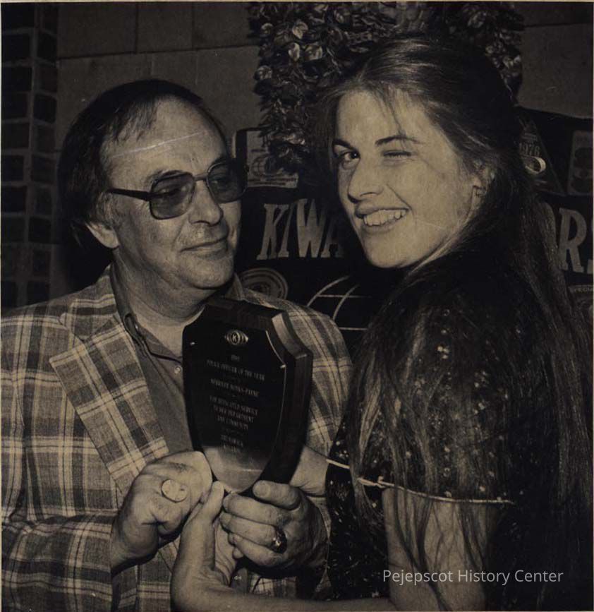 A B/W photographic view of Marrilee Monks-Paine, Brunswick's first female police officer, receiving the Police Officer of the Year by the Kiwanis Club. Victor Lemieux making the presentation