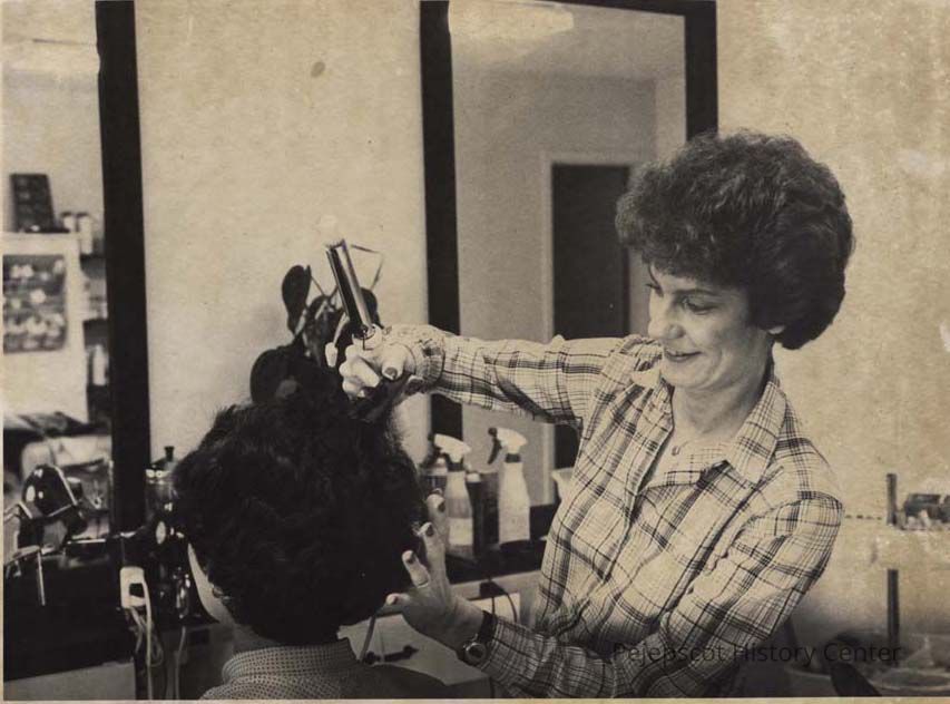 A B/W photographic view of Martha Bumgardner cutting some woman's hair. This photo was published 6/30/1981.