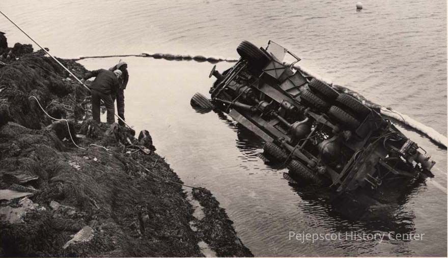 A B/W photographic view of Martin Baker Well Drilling truck in the water.