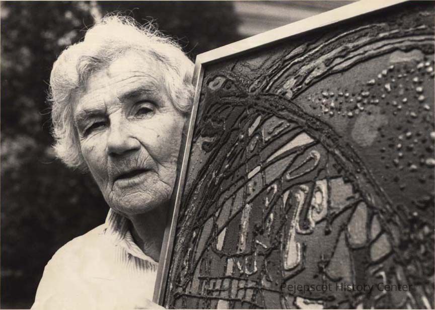 A B/W photographic view of Mary E. Crockett, holding the painting "One World".. This photo was published 9/10/1992.