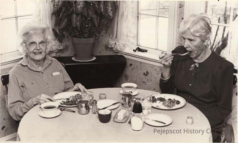 A B/W photographic view of Mary Holland and Alice Dove at the Stevens Home in Brunswick.. This photo was published 2/4/1992.
