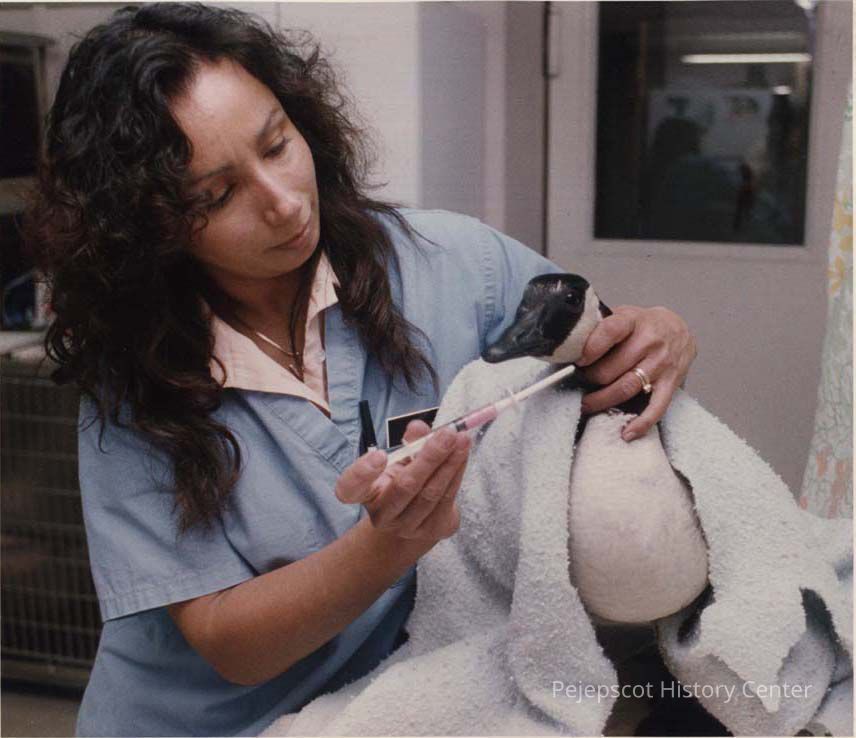 A color photographic view of Mary Page with a goose. This photo was published 12/27/1991.