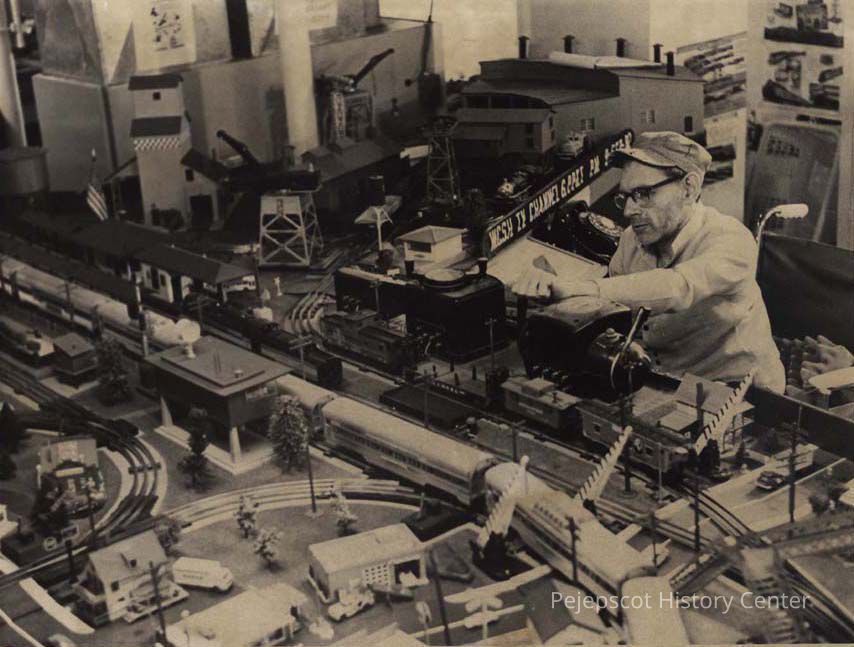 A B/W photographic view of Maurice Joseph Paul Baribeau and his model train layout.. This photo was published 4/9/1984.