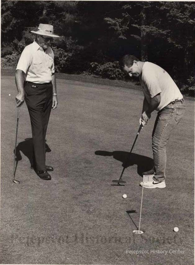 A B/W photographic view of Mel Strange and Bob Stiehlen playing golf.