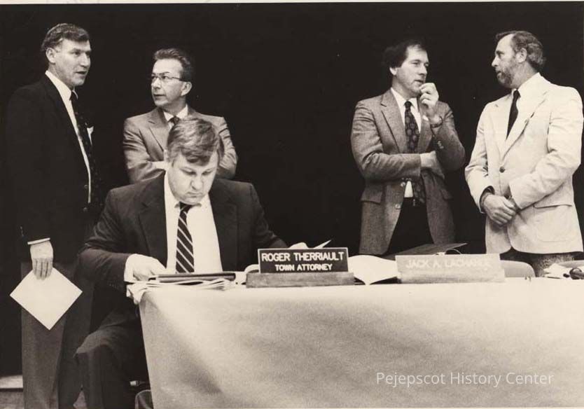 A B/W photographic view of Curt Lunt, Robert Berube, Roger Therriault, David Bowie and Jack LaChance just before the meeting started.