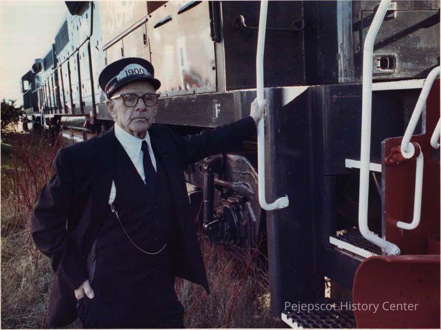 A color photographic view of Merv Harriman conductor on the excursion train which runs from Brunswick to Rockland. This photo was published 11/8/1990.