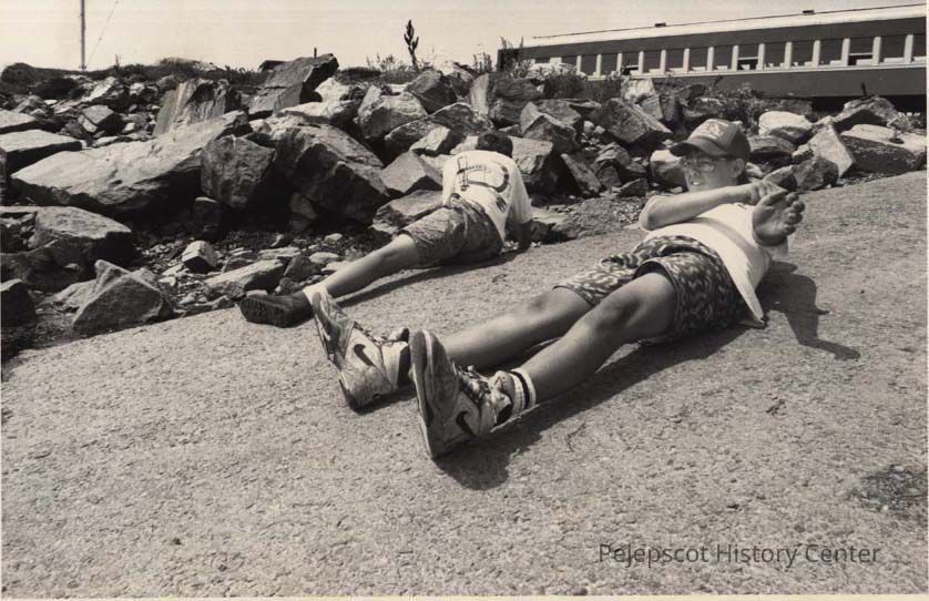 A B/W photographic view of Mike Dentro and Jon Sawyer sun bathing..