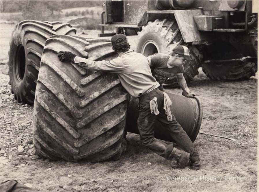 A B/W photographic view of Mike Quimbey and Ron Morhidge changing a tire. This photo was published 11/13/1992.