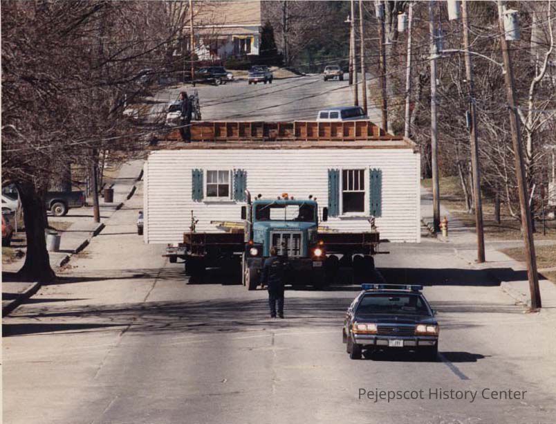 A photo view of moving a house.3/28/1990.