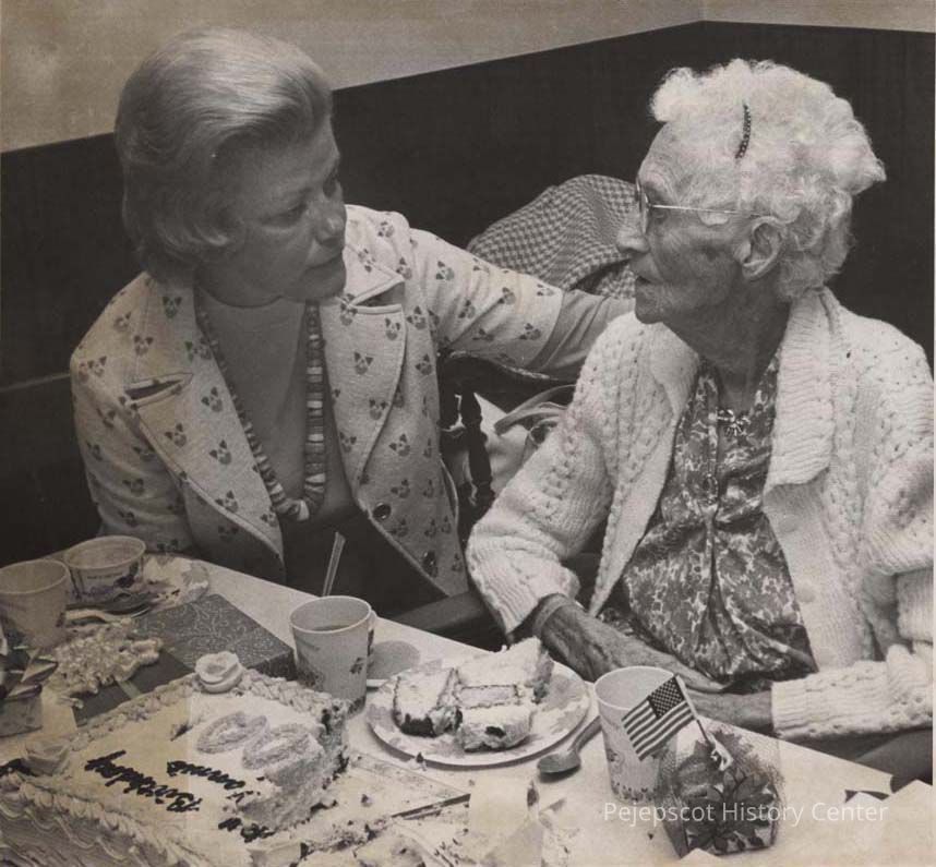 A B/W photographic view of Mrs. Frances Learned celebrates her 100th birthday. (I believe this is the same person as the Mrs. Frances Leonard who appeared in the previous 2 photos. 2003.546e.5295 & .5296.) This photo was published 6/20/1975.
