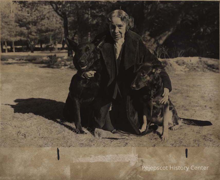 A B/W photographic view of Muriel Poland an avid trainer of German Shepherds passed away in June. This photo was published 7/23/1990.