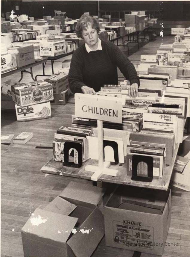 A B/W photographic view of volunteer Nancy Gardner at the Longfellow School Book Sale set up.