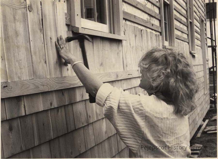 A B/W photographic view of Patsy Hennin putting up cedar shingles. This photo was published 5/21/1992.