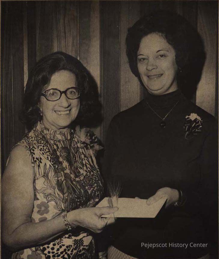 A B/W photographic view of Pauline Siatras receiving the "Woman of the Year" award from Jackie Lemieux. This photo was published 10/16/1975.