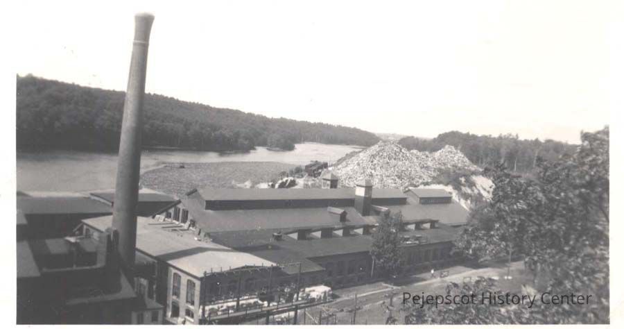 A B/W photographic view of the Pejepscot Paper Mill along with the pulpwood in the river and the pulpwood piles. This photo is very similar to 2010.87.5.