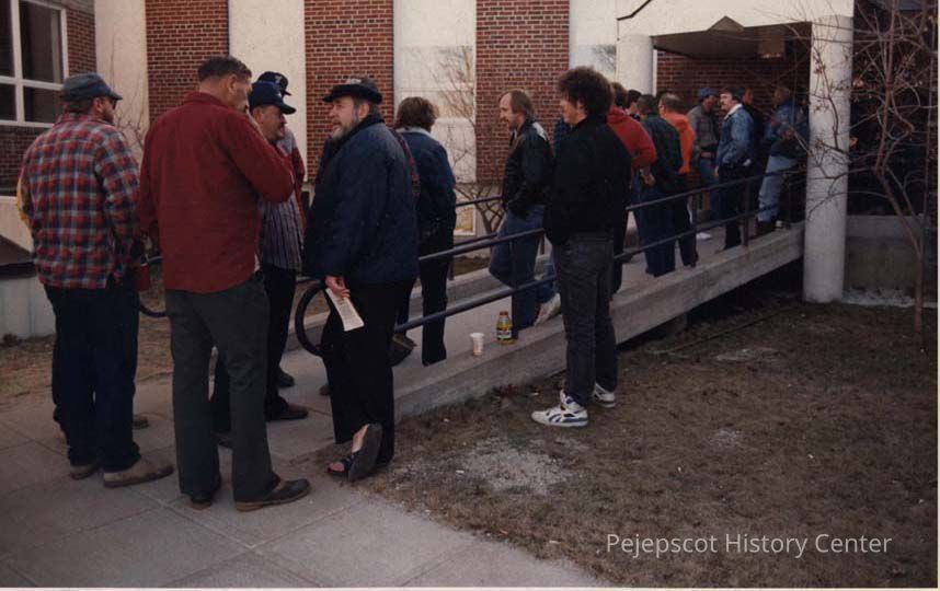 A color photographic view of people in a line. This photo was published 3/19/1990.