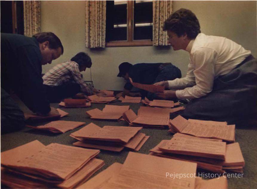 A color photographic view of people sorting papers. Ballots? This photo was published 11/8/1988.
